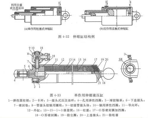 伸縮式液壓缸具有二級(jí)或多級(jí)活塞,伸縮式液壓缸中活塞伸出的順序式從大到小,而空載縮回的順序則一般是從小到大。伸縮缸可實(shí)現(xiàn)較長(zhǎng)的行程,而縮回時(shí)長(zhǎng)度較短,結(jié)構(gòu)較為緊湊。此種液壓缸常用于工程機(jī)械和農(nóng)業(yè)機(jī)械上。有多個(gè)一次運(yùn)動(dòng)的活塞,各活塞逐次運(yùn)動(dòng)時(shí),其輸出速度和輸出力均是變化的。